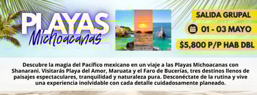 Con más de 20 años de experiencia en Uruapan, Michoacán, somos una agencia de viajes dedicada a planear experiencias inolvidables con total seguridad y confianza. Ya sea para vacaciones familiares o viajes de negocios, te acompañamos en destinos nacionales e internacionales, invitándote a formar parte de la familia de viajeros Shanarani y a disfrutar de nuestras exclusivas experiencias grupales.